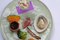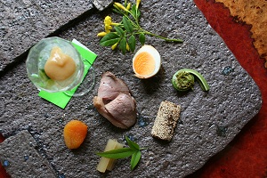 【前菜】鴨ロース・酢玉子・あんず・こごみ・けしの実牛蒡・セロリの土佐漬・葱くらげの酢味噌和え