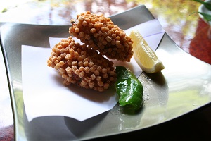 【揚物】鶏挽肉俵揚げ・ベータリッチ・スティックセニョール・レモン・抹茶塩