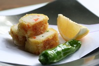 【揚げ物】じゃが芋真丈あられ揚げ・獅子唐・レモン・抹茶塩