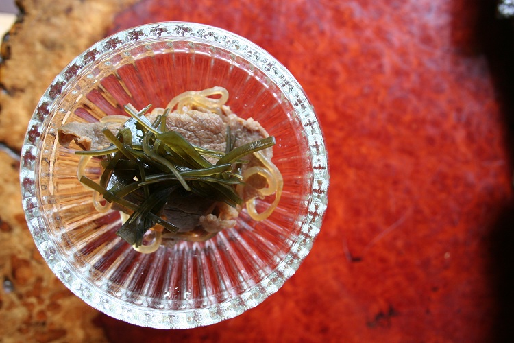先付 - 前菜 - 造り - 蒸し物 - 煮物 - 和牛ステーキ - 食事 - 吸物 - 甘味